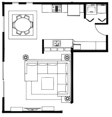 Entertain in comfort and distinction in this warm, well-bred living space. This area echoes the distinguished tones chosen for your new bachelor bungalow. For your pleasure, I have repeated dark rich woods, succulent green potted plants and added a lean leggy floor lamp paired with matching table fixtures, a cosmopolitan television console, and ample shelving for storage or to display of all the things that make you, you. Enjoy the statement that this space makes about you. |